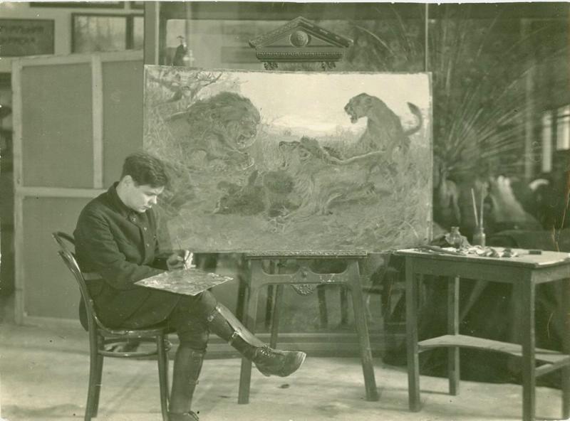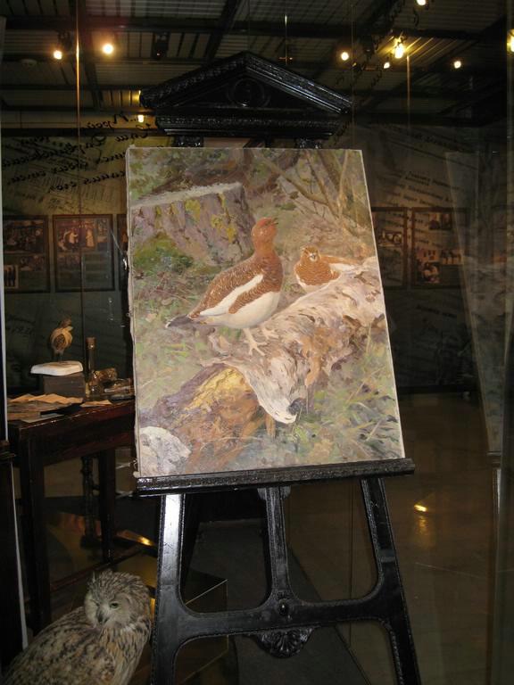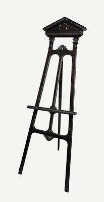 Мольберт черный деревянный резной покрыт лаком. Конструкция мольберта простая трёхопорная: две передние ножки скреплены поперечными планками, третья ножка уравновешивает конструкцию. По верхнему краю расположен резной наличник с растительным орнаментом; поперечная планка отделана узкой полоской резьбы со стилизованным растительным орнаментом. Общая высота - 202 см, ширина передней панели - 59 см, ширина резной перекладины-подставки под картину - 9 см, высота третьей опорной ноги - 154 см, ширина плпнок по 2 см.