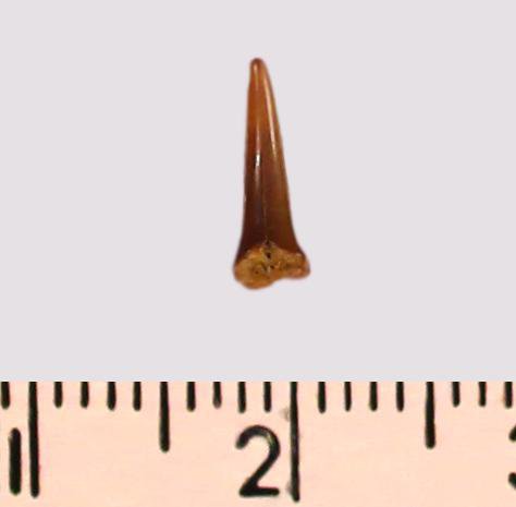 Зуб (фрагмент). Акула. Eostriatolamia subulata (Agassiz, 1843). Классификация: Хордовые Chordata, Позвоночные Vertebrata, Хрящевые рыбы Chondrichthyes, Пластиножаберные Elasmobranchii, Акулы Selachii, Ламнообразные Lamniformes