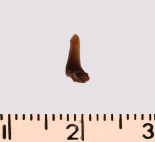 Зуб (фрагмент). Акула. Odontaspis striatula Dalinkevicius, 1935. Классификация: Хордовые Chordata, Позвоночные Vertebrata, Хрящевые рыбы Chondrichthyes, Пластиножаберные Elasmobranchii, Акулы Selachii, Ламнообразные Lamniformes