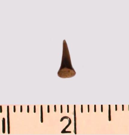 Зуб (фрагмент). Акула. Odontaspis subulata (Agassiz, 1843). Классификация: Хордовые Chordata, Позвоночные Vertebrata, Хрящевые рыбы Chondrichthyes, Пластиножаберные Elasmobranchii, Акулы Selachii, Ламнообразные Lamniformes