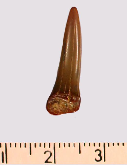 Зуб (фрагмент). Акула. Scapanorhynchus gigas Woodward, 1889. Классификация: Хордовые Chordata, Позвоночные Vertebrata, Хрящевые рыбы Chondrichthyes, Пластиножаберные Elasmobranchii