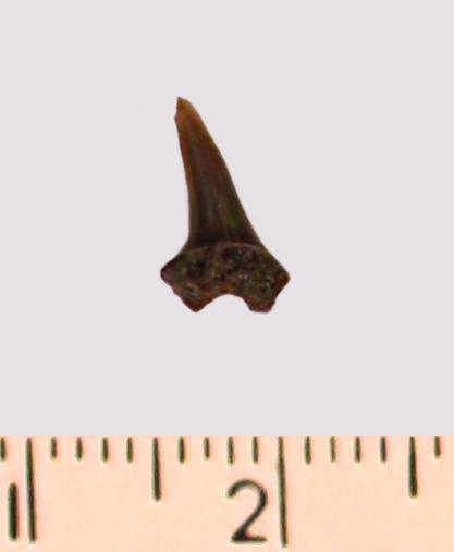 Зуб (фрагмент). Акула. Eostriatolamia subulata (Agassiz, 1843). Классификация: Хордовые Chordata, Позвоночные Vertebrata, Хрящевые рыбы Chondrichthyes, Пластиножаберные Elasmobranchii