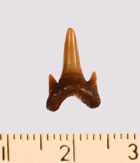 Зуб. Акула. Odontaspis macrorhiza (Cope) Leriche, 1902. Классификация: Хордовые Chordata, Позвоночные Vertebrata, Хрящевые рыбы Chondrichthyes, Пластиножаберные Elasmobranchii