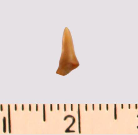 Зуб (фрагмент). Акула. Eostriatolamia gracilis (Davis, 1890). Классификация: Хордовые Chordata, Позвоночные Vertebrata, Хрящевые рыбы Chondrichthyes, Пластиножаберные Elasmobranchii