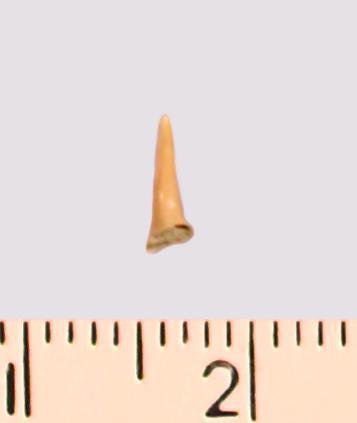 Зуб (фрагмент). Акула. Eostriatolamia gracilis (Davis, 1890). Классификация: Хордовые Chordata, Позвоночные Vertebrata, Хрящевые рыбы Chondrichthyes, Пластиножаберные Elasmobranchii