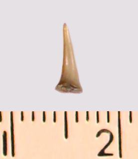 Зуб (фрагмент). Акула. Eostriatolamia gracilis (Davis, 1890). Классификация: Хордовые Chordata, Позвоночные Vertebrata, Хрящевые рыбы Chondrichthyes, Пластиножаберные Elasmobranchii