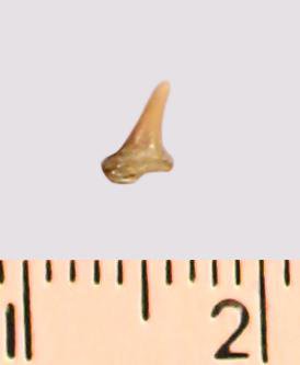 Зуб (фрагмент). Акула. Eostriatolamia gracilis (Davis, 1890). Классификация: Хордовые Chordata, Позвоночные Vertebrata, Хрящевые рыбы Chondrichthyes, Пластиножаберные Elasmobranchii