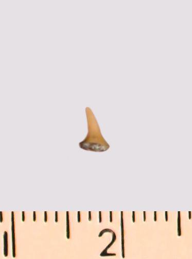 Зуб (фрагмент). Акула. Eostriatolamia gracilis (Davis, 1890). Классификация: Хордовые Chordata, Позвоночные Vertebrata, Хрящевые рыбы Chondrichthyes, Пластиножаберные Elasmobranchii