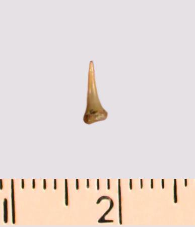 Зуб (фрагмент). Акула. Eostriatolamia gracilis (Davis, 1890). Классификация: Хордовые Chordata, Позвоночные Vertebrata, Хрящевые рыбы Chondrichthyes, Пластиножаберные Elasmobranchii