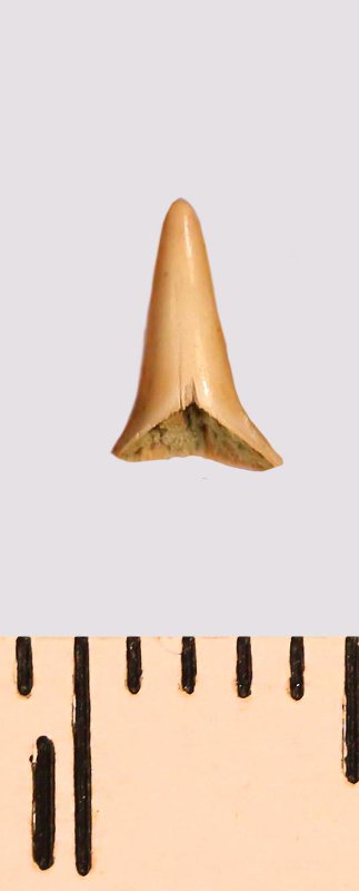 Зуб (фрагмент). Акула. Eostriatolamia gracilis (Davis, 1890). Классификация: Хордовые Chordata, Позвоночные Vertebrata, Хрящевые рыбы Chondrichthyes, Пластиножаберные Elasmobranchii