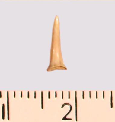 Зуб (фрагмент). Акула. Eostriatolamia gracilis (Davis, 1890). Классификация: Хордовые Chordata, Позвоночные Vertebrata, Хрящевые рыбы Chondrichthyes, Пластиножаберные Elasmobranchii