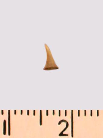 Зуб (фрагмент). Акула. Eostriatolamia gracilis (Davis, 1890). Классификация: Хордовые Chordata, Позвоночные Vertebrata, Хрящевые рыбы Chondrichthyes, Пластиножаберные Elasmobranchii