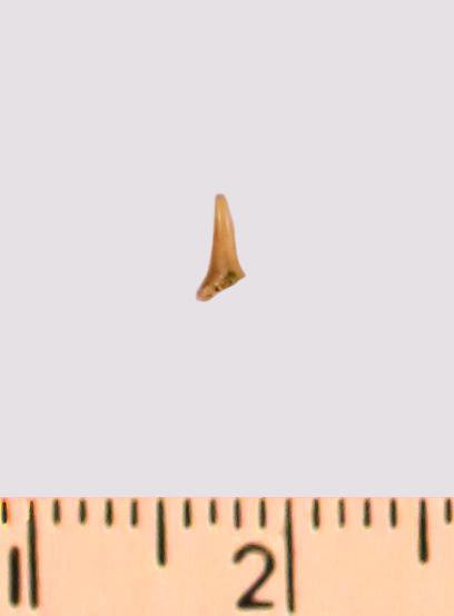 Зуб (фрагмент). Акула. Eostriatolamia gracilis (Davis, 1890). Классификация: Хордовые Chordata, Позвоночные Vertebrata, Хрящевые рыбы Chondrichthyes, Пластиножаберные Elasmobranchii