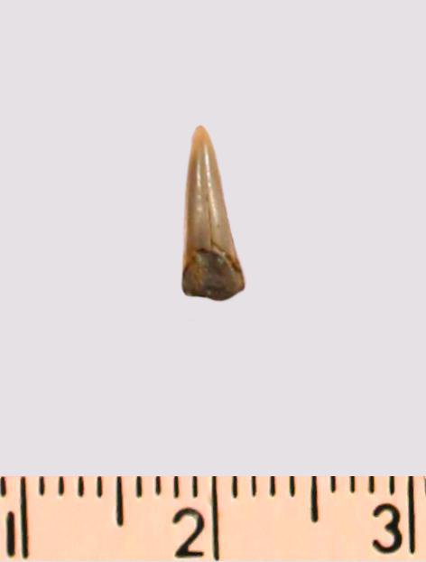 Зуб (фрагмент). Акула. Odontaspis macrorhiza (Cope) Leriche, 1902. Классификация: Хордовые Chordata, Позвоночные Vertebrata, Хрящевые рыбы Chondrichthyes, Пластиножаберные Elasmobranchii