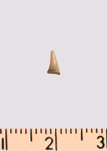 Зуб (фрагмент). Акула. Odontaspis macrorhiza (Cope) Leriche, 1902. Классификация: Хордовые Chordata, Позвоночные Vertebrata, Хрящевые рыбы Chondrichthyes, Пластиножаберные Elasmobranchii