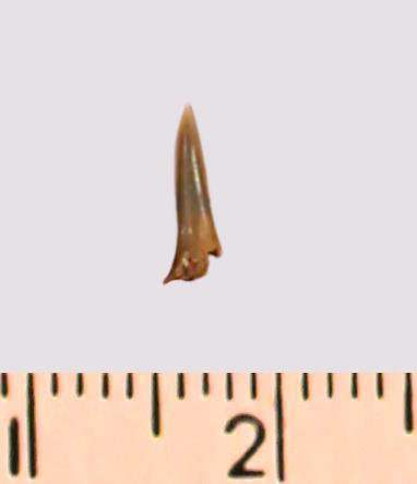 Зуб (фрагмент). Акула. Eostriatolamia gracilis (Davis, 1890). Классификация: Хордовые Chordata, Позвоночные Vertebrata, Хрящевые рыбы Chondrichthyes, Пластиножаберные Elasmobranchii