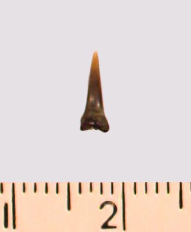 Зуб (фрагмент). Акула. Eostriatolamia gracilis (Davis, 1890). Классификация: Хордовые Chordata, Позвоночные Vertebrata, Хрящевые рыбы Chondrichthyes, Пластиножаберные Elasmobranchii