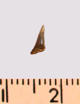 Зуб (фрагмент). Акула. Eostriatolamia gracilis (Davis, 1890). Классификация: Хордовые Chordata, Позвоночные Vertebrata, Хрящевые рыбы Chondrichthyes, Пластиножаберные Elasmobranchii