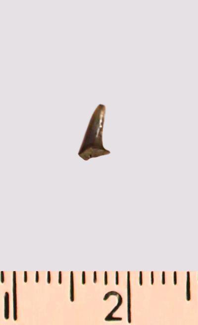 Зуб (фрагмент). Акула. Eostriatolamia gracilis (Davis, 1890). Классификация: Хордовые Chordata, Позвоночные Vertebrata, Хрящевые рыбы Chondrichthyes, Пластиножаберные Elasmobranchii