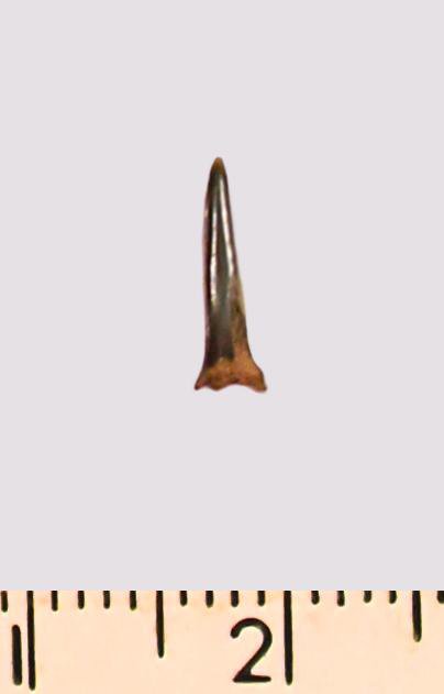 Зуб (фрагмент). Акула. Eostriatolamia gracilis (Davis, 1890). Классификация: Хордовые Chordata, Позвоночные Vertebrata, Хрящевые рыбы Chondrichthyes, Пластиножаберные Elasmobranchii