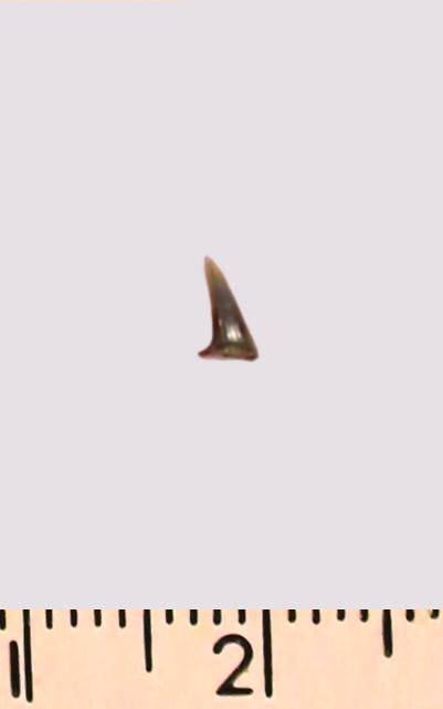 Зуб (фрагмент). Акула. Eostriatolamia gracilis (Davis, 1890). Классификация: Хордовые Chordata, Позвоночные Vertebrata, Хрящевые рыбы Chondrichthyes, Пластиножаберные Elasmobranchii
