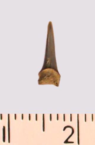 Зуб (фрагмент). Акула. Eostriatolamia gracilis (Davis, 1890). Классификация: Хордовые Chordata, Позвоночные Vertebrata, Хрящевые рыбы Chondrichthyes, Пластиножаберные Elasmobranchii