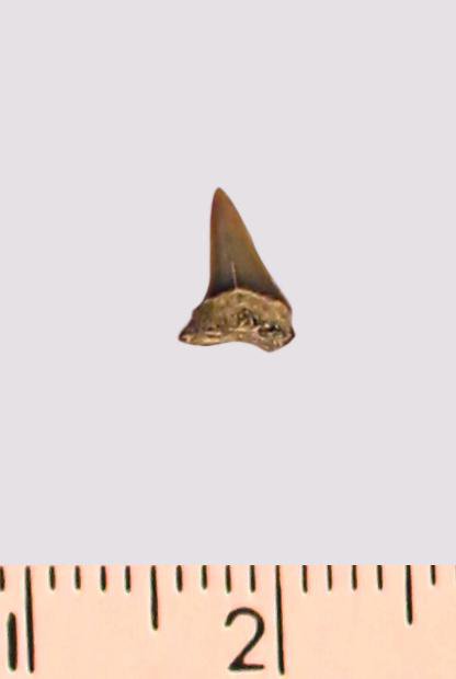 Зуб (фрагмент). Акула. Eostriatolamia gracilis (Davis, 1890). Классификация: Хордовые Chordata, Позвоночные Vertebrata, Хрящевые рыбы Chondrichthyes, Пластиножаберные Elasmobranchii