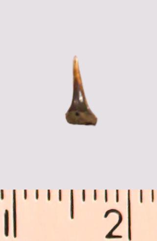 Зуб (фрагмент). Акула. Eostriatolamia gracilis (Davis, 1890). Классификация: Хордовые Chordata, Позвоночные Vertebrata, Хрящевые рыбы Chondrichthyes, Пластиножаберные Elasmobranchii