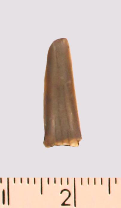 Зуб (фрагмент). Акула. Scapanorhynchus gigas Woodward 1889. Классификация: Хордовые Chordata, Позвоночные Vertebrata, Хрящевые рыбы Chondrichthyes, Пластиножаберные Elasmobranchii