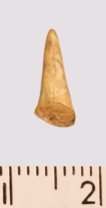 Зуб (фрагмент). Акула. Odontaspis macrorhiza (Cope) Leriche, 1902. Классификация: Хордовые Chordata, Позвоночные Vertebrata, Хрящевые рыбы Chondrichthyes, Пластиножаберные Elasmobranchii