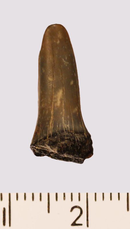 Зуб (фрагмент). Акула. Scapanorhynchus gigas Woodward 1889. Классификация: Хордовые Chordata, Позвоночные Vertebrata, Хрящевые рыбы Chondrichthyes, Пластиножаберные Elasmobranchii