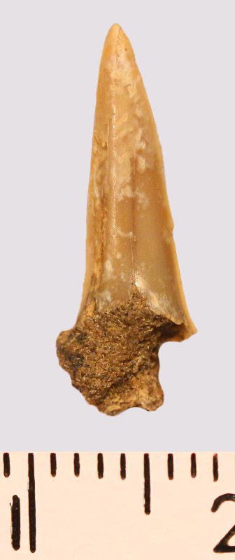 Зуб (фрагмент). Акула. Odontaspis macrorhiza (Cope) Leriche, 1902. Классификация: Хордовые Chordata, Позвоночные Vertebrata, Хрящевые рыбы Chondrichthyes, Пластиножаберные Elasmobranchii