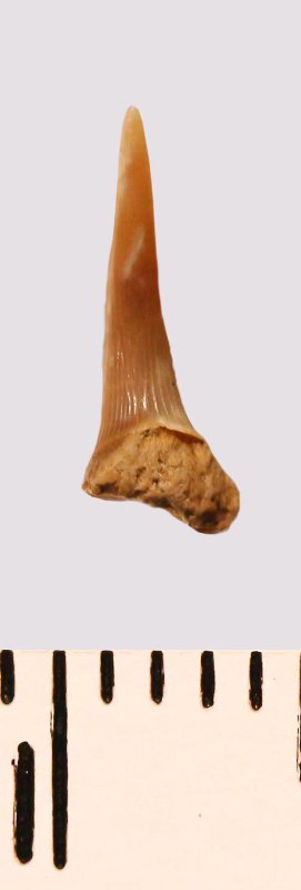 Зуб (фрагмент). Акула. Eostriatolamia sp. Классификация: Хордовые Chordata, Позвоночные Vertebrata, Хрящевые рыбы Chondrichthyes, Пластиножаберные Elasmobranchii