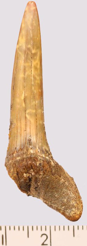 Зуб. Акула. Scapanorhynchus gigas Woodward 1889. Классификация: Хордовые Chordata, Позвоночные Vertebrata, Хрящевые рыбы Chondrichthyes, Пластиножаберные Elasmobranchii