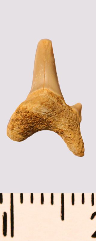 Зуб. Акула. Odontaspis macrorhiza (Cope) Leriche, 1902. Классификация: Хордовые Chordata, Позвоночные Vertebrata, Хрящевые рыбы Chondrichthyes, Пластиножаберные Elasmobranchii