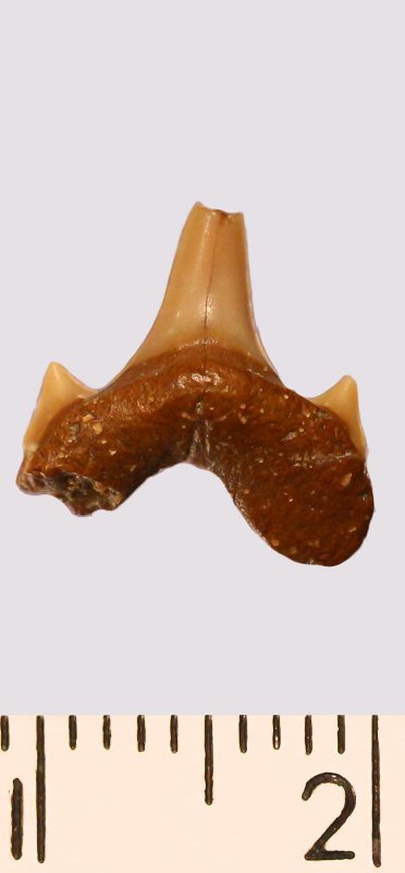 Зуб. Акула. Odontaspis macrorhiza (Cope) Leriche, 1902. Классификация: Хордовые Chordata, Позвоночные Vertebrata, Хрящевые рыбы Chondrichthyes, Пластиножаберные Elasmobranchii