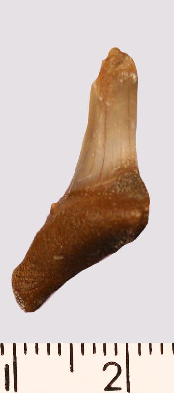 Зуб (фрагмент). Акула. Scapanorhynchus gigas Woodward 1889. Классификация: Хордовые Chordata, Позвоночные Vertebrata, Хрящевые рыбы Chondrichthyes, Пластиножаберные Elasmobranchii