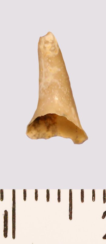 Зуб (фрагмент). Акула. Odontaspis macrorhiza (Cope) Leriche, 1902. Классификация: Хордовые Chordata, Позвоночные Vertebrata, Хрящевые рыбы Chondrichthyes, Пластиножаберные Elasmobranchii