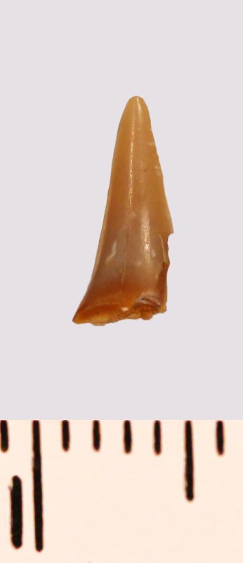 Зуб (фрагмент). Акула. Odontaspis macrorhiza (Cope) Leriche, 1902. Классификация: Хордовые Chordata, Позвоночные Vertebrata, Хрящевые рыбы Chondrichthyes, Пластиножаберные Elasmobranchii
