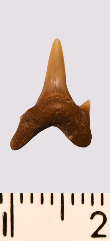 Зуб. Акула. Odontaspis macrorhiza (Cope) Leriche, 1902. Классификация: Хордовые Chordata, Позвоночные Vertebrata, Хрящевые рыбы Chondrichthyes, Пластиножаберные Elasmobranchii