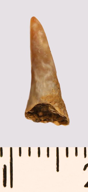 Зуб (фрагмент). Акула. Odontaspis macrorhiza (Cope) Leriche, 1902. Классификация: Хордовые Chordata, Позвоночные Vertebrata, Хрящевые рыбы Chondrichthyes, Пластиножаберные Elasmobranchii