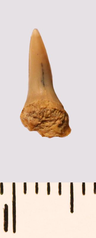 Зуб (фрагмент). Акула. Odontaspis macrorhiza (Cope) Leriche, 1902. Классификация: Хордовые Chordata, Позвоночные Vertebrata, Хрящевые рыбы Chondrichthyes, Пластиножаберные Elasmobranchii