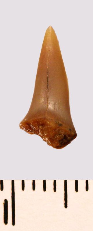 Зуб (фрагмент). Акула. Odontaspis macrorhiza (Cope) Leriche, 1902. Классификация: Хордовые Chordata, Позвоночные Vertebrata, Хрящевые рыбы Chondrichthyes, Пластиножаберные Elasmobranchii
