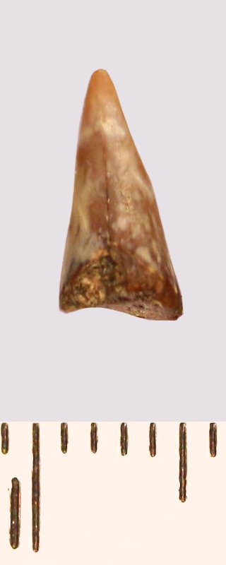 Зуб (фрагмент). Акула. Odontaspis macrorhiza (Cope) Leriche, 1902. Классификация: Хордовые Chordata, Позвоночные Vertebrata, Хрящевые рыбы Chondrichthyes, Пластиножаберные Elasmobranchii