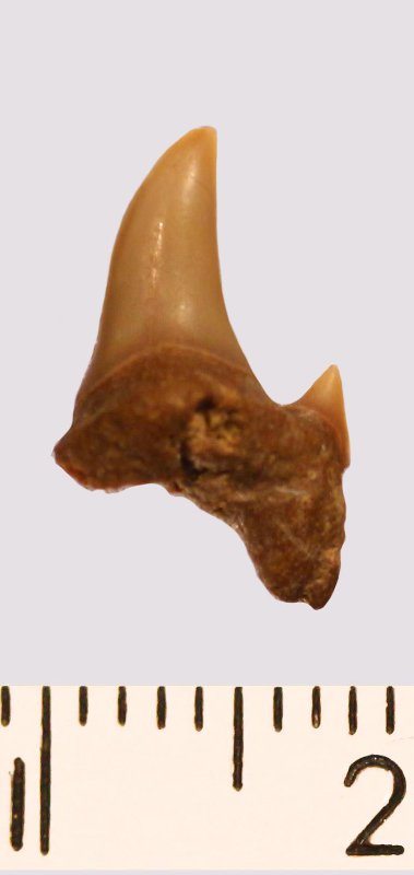 Зуб. Акула. Odontaspis macrorhiza (Cope) Leriche, 1902. Классификация: Хордовые Chordata, Позвоночные Vertebrata, Хрящевые рыбы Chondrichthyes, Пластиножаберные Elasmobranchii