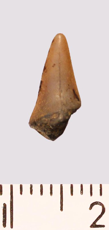 Зуб (фрагмент). Акула. Lamniformes gen. et sp. indet. Классификация: Хордовые Chordata, Позвоночные Vertebrata, Хрящевые рыбы Chondrichthyes, Пластиножаберные Elasmobranchii