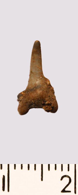 Зуб. Акула. Odontaspis striatula Dalinkevicius, 1935. Классификация: Хордовые Chordata, Позвоночные Vertebrata, Хрящевые рыбы Chondrichthyes, Пластиножаберные Elasmobranchii