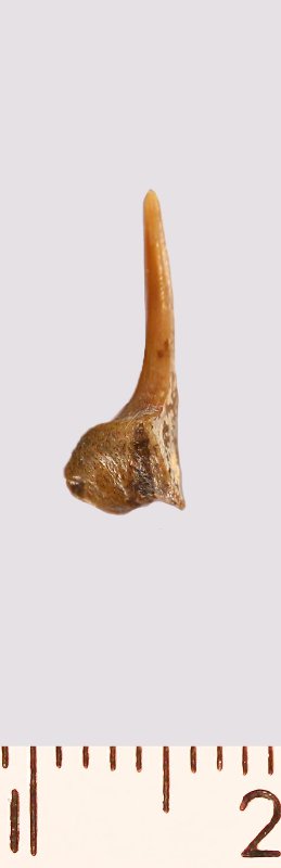 Зуб (фрагмент). Акула. Scapanorhynchus raphiodon (Agassiz, 1843). Классификация: Хордовые Chordata, Позвоночные Vertebrata, Хрящевые рыбы Chondrichthyes, Пластиножаберные Elasmobranchii