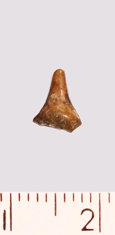 Зуб (фрагмент). Акула. Scyliorhinidae gen. et sp. indet.? Классификация: Хордовые Chordata, Позвоночные Vertebrata, Хрящевые рыбы Chondrichthyes, Пластиножаберные Elasmobranchii