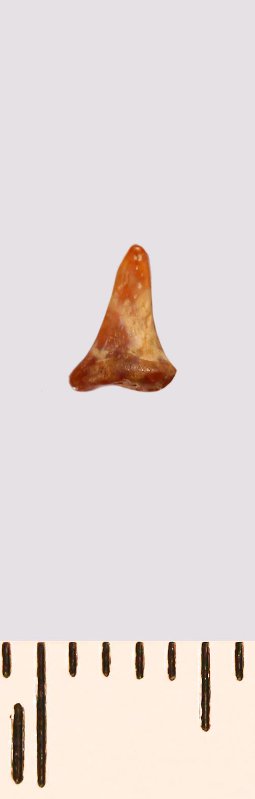 Зуб (фрагмент). Акула. Odontaspis striatula Dalinkevicius, 1935. Классификация: Хордовые Chordata, Позвоночные Vertebrata, Хрящевые рыбы Chondrichthyes, Пластиножаберные Elasmobranchii